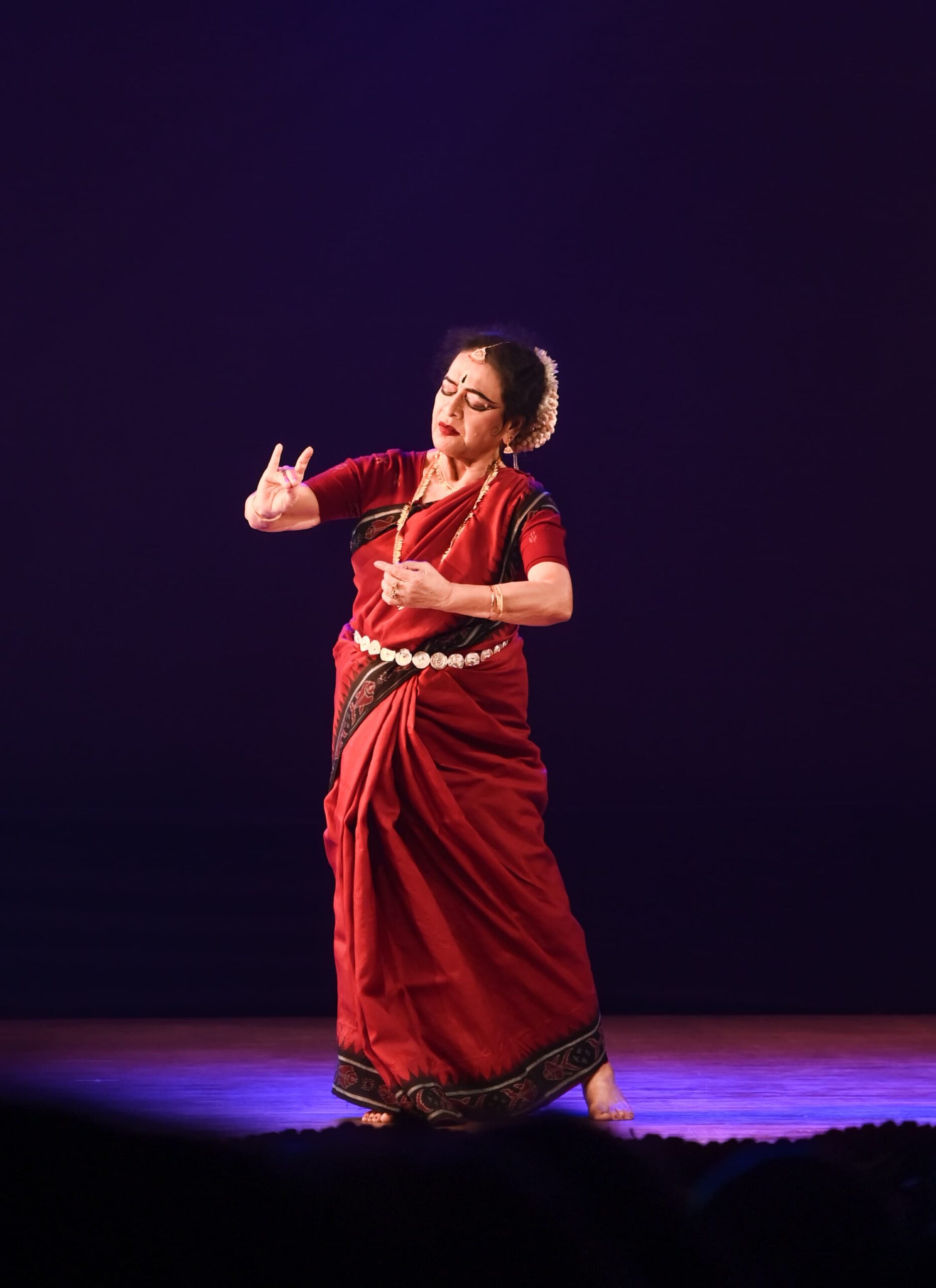 The penultimate performer of the evening was Smt Aloka Kanungo, who trained under Guru Raghunatha Dutta, Guru Mayadhar Rout and later Guruji and is running her institution ‘Shijan Nrityalaya’ in Kolkata. She presented an abhinaya ‘Patha Chhadi De’. Her abhinaya delicately portrayed Krishna’s playful obstruction of Radha, allowing her to leave only after securing her promise to return—an episode rendered with charm and narrative clarity.