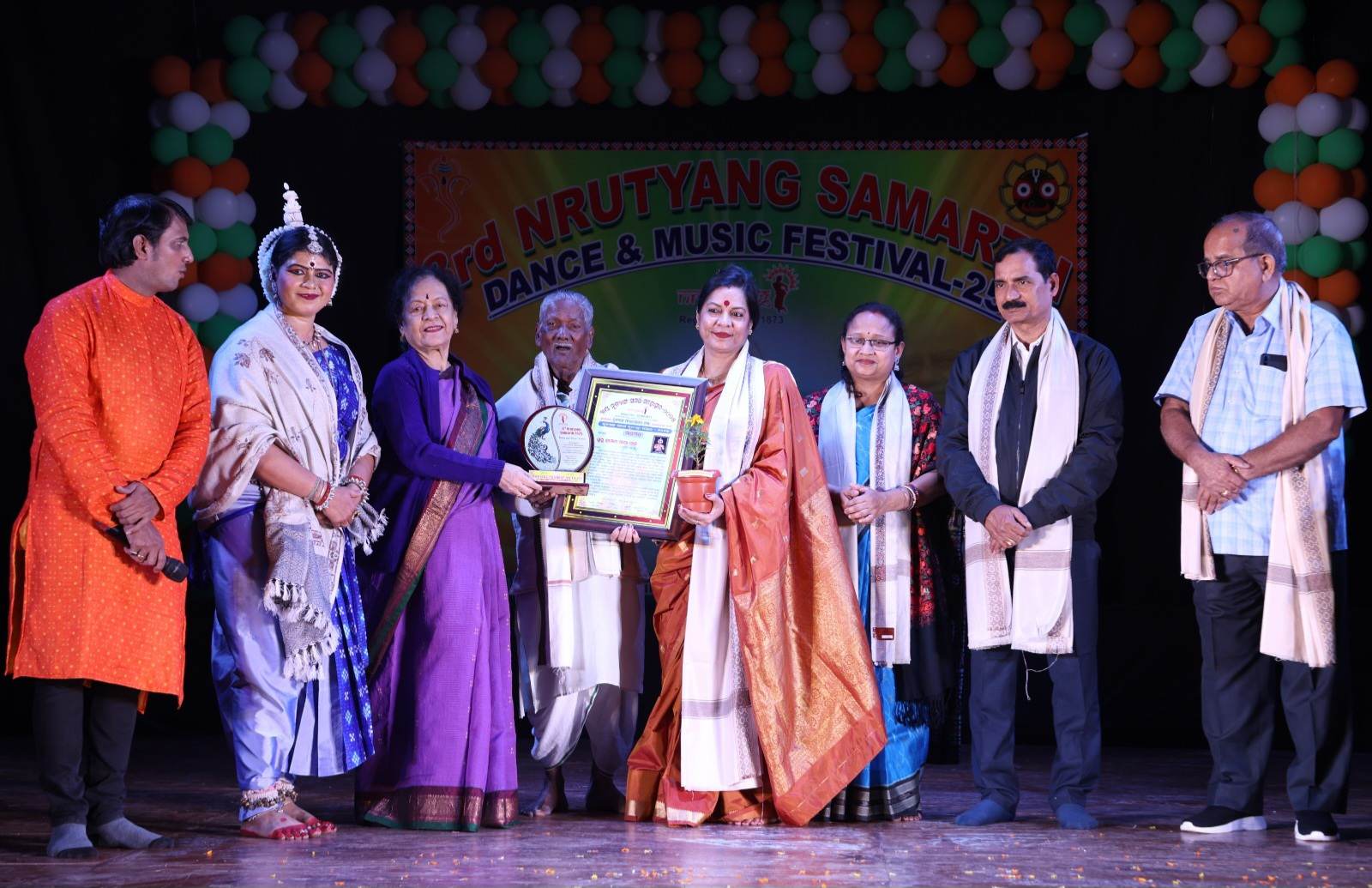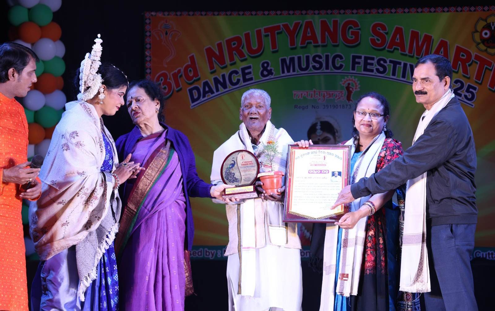 The felicitation ceremony followed next. While Pandit Harmohan Khuntia was honoured with ‘Nrutyang Samarth Biraja Prasad Samman’, Odissi exponent Mrs Meera Das, young and talented Odissi dancer Guru Mr Gourishankar Dash, noted Mardala player Guru Mr Gouranga Charan Mahala, young Mardala player Mr Tarini Prasad Das received ‘3rd Nrutyang Samarth Nrutyashree Samman’, ‘3rd Nrutyang Samarth Nrutya Gourav Samman’, ‘3rd Nrutyang Samarth Kala Prativa Samman’, and ‘3rd Nrutyang Samarth Yuva Prativa Samman’ respectively.