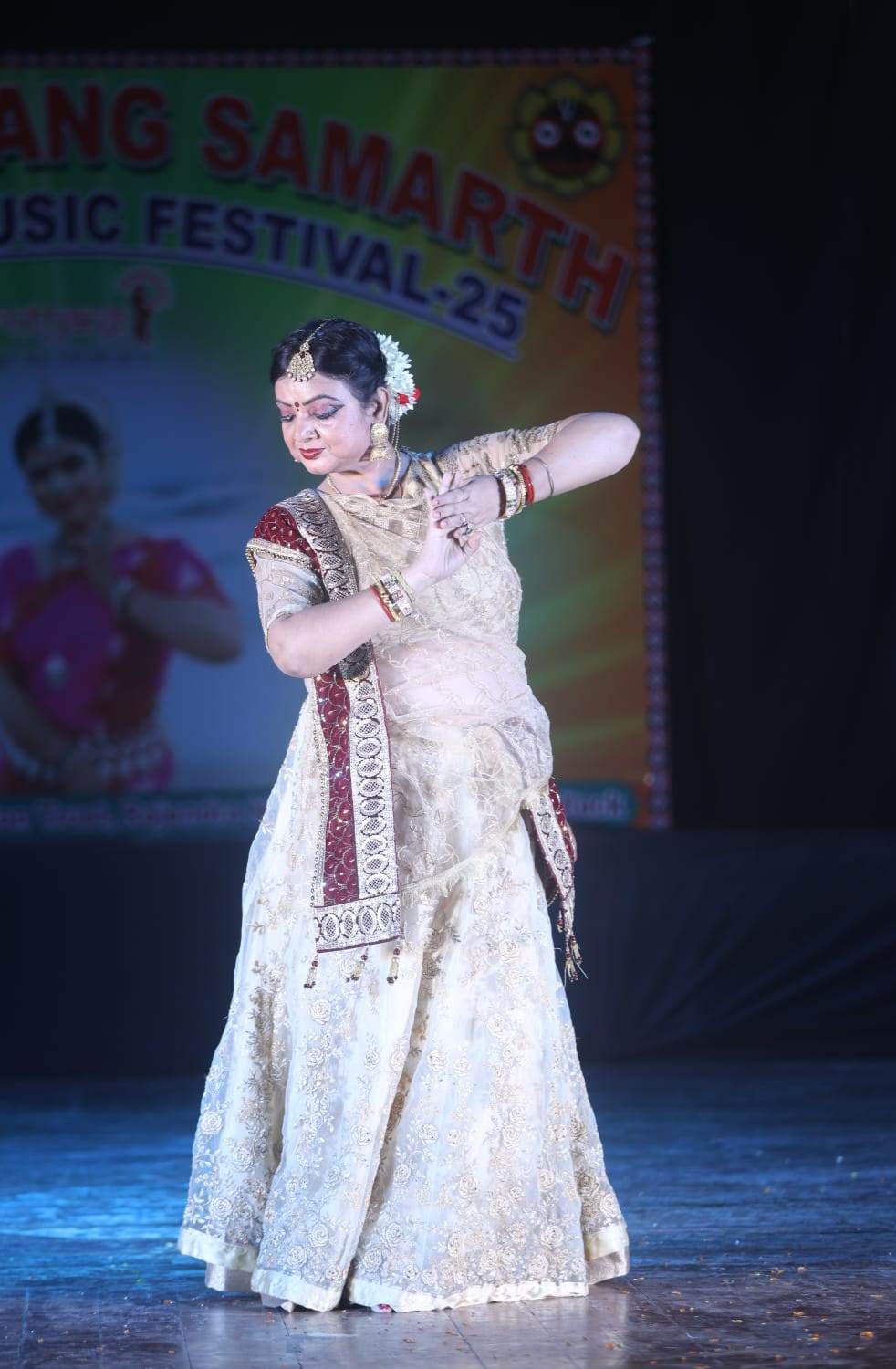 Adding variety to the evening, Kathak dancer Smt Sangeeta Sahoo came onto the stage and presented a solo recital. She enthralled the audience with her energetic footwork and perfect pirouettes.