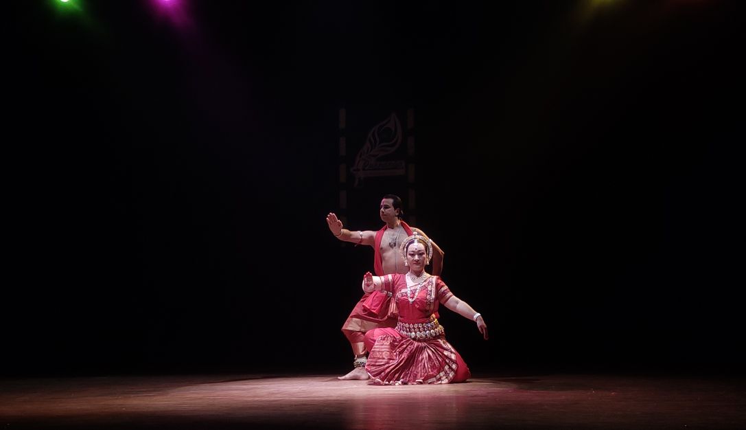 The spotlight was then shifted to the festival’s most anticipated item, a duet Odissi recital by Guru Abhijit Deb and Xiaozhen Zhao, (Beijing). They presented ‘Ardhanariswar Shlokam’, set to Raga Ragamalika and Tala Talamalika, a celebrated choreography of legendary Guru Kelucharan Mohapatra with music composed by Pandit Bhubaneswar Mishra.Their depiction of Shiva and Parvati’s unified form was executed with impeccable coordination and arresting visuals. Particularly striking were their poses formed by standing one behind the other, evocatively portraying the duality and unity of the divine energies.
